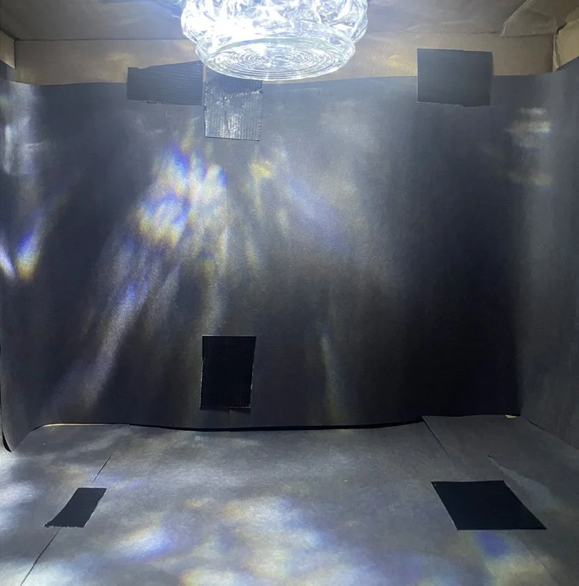 Results were the intended effect, a shifting projection of refracted light that could cast on a surface behind the light. The box form allowed for use as a display or small shelf without obstruction the light itself.